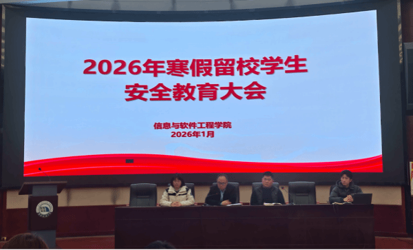为切实做好寒假期间留校学生的安全教育与管理工作,增强学生安全意识,2026年1月11日,信息与软件工程学院在北图圆形报告厅组织召开寒假留校学生安全教育大会。院党委副书记冯荣刚、辅导员刘妮、姚雄俊、张阳森及全体留校学生参会。