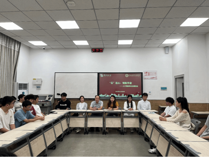 2025年10月9日下午,“芯”连心·领航学途——2024级人工智能专业学风建设主题班会在南区25栋116教室顺利举行。信息与软件工程学院副院长张利华、辅导员张宇婷、2023级软件工程专业ACM校队负责人肖扬及2024级人工智能专业全体学生参加。