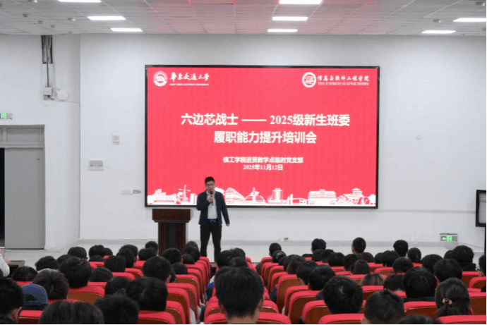 加强信息与软件工程学院2025级班级学生干部队伍建设,提升履职能力与服务意识,实现“保障教学秩序稳定,服务新生成长成才”的目标,2025年11月12日,学院于进贤教学点教学楼509报告厅举行2025级新生班委履职能力提升培训会。院党委书记魏永峰、院党委副书记冯荣刚出席此次会议。进贤教学点全体辅导员、2025级新生班委共计270人参会。