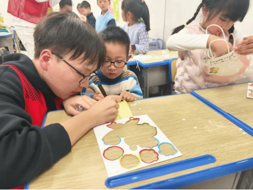 知识讲解环节结束后,学长学姐们分发了精心准备的手工材料包,耐心地一对一指导小朋友们挑选花朵贴片和动物贴纸,制作独一无二的创意贺卡。这种"知识+实践"的双模式,让整个活动更加充实有趣。